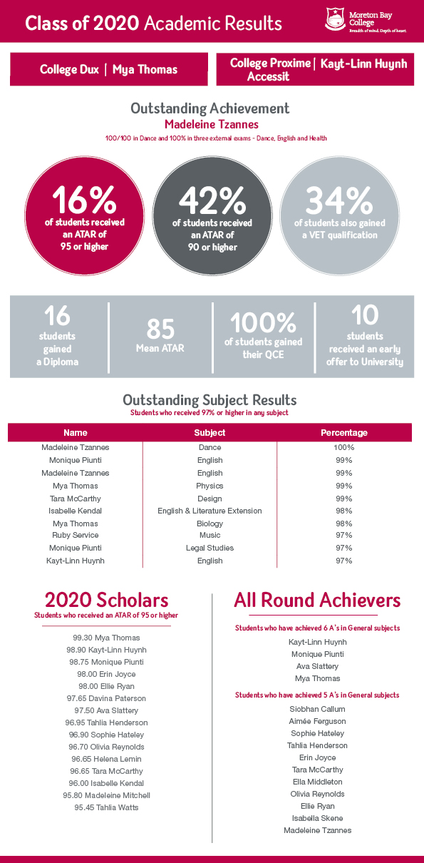 We are thrilled to report that 100% of our students have graduated with a Queensland Certificate of Education (QCE). Every student also graduated with an Australian Tertiary Admission Rank (ATAR) and/or Vocational Education and Training (VET) qualifications. A total of 33 students, 34% of the cohort, graduated with a VET qualification.